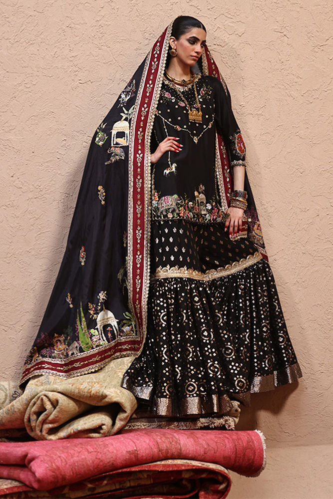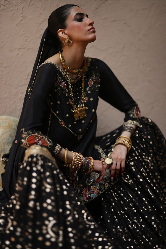 A timeless black short shirt in pure 80gms raw silk with gharara, adorned with Mughal-inspired digital motifs, resham, zari, zardozi, and embellished with cutdana, crystals, stones, sequins, dabka, nakshi, pearls, and handmade tassels on the front, back, and sleeves. The gharara comes in two lorex variations with banarsi borders. Optional pure silk dupattas include a heavy four-sided gold embroidered bail with zardozi and resham botis or a lighter allover motif with delicate detailing. An optional black sheesha silk shawl with Mughal digital print, zari, and zardozi work adds a regal finish.