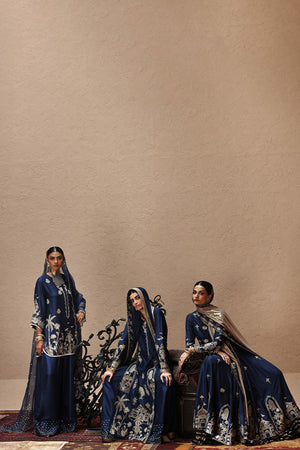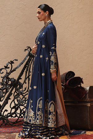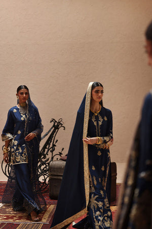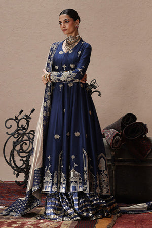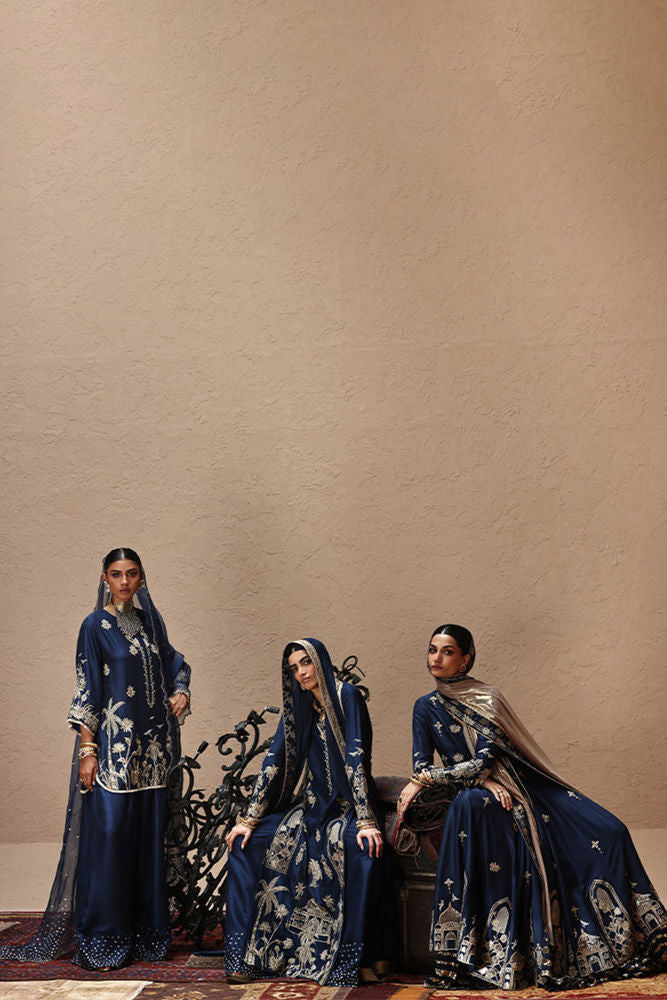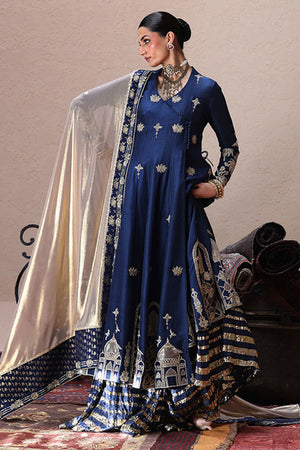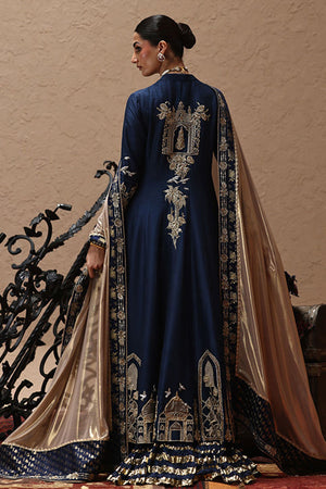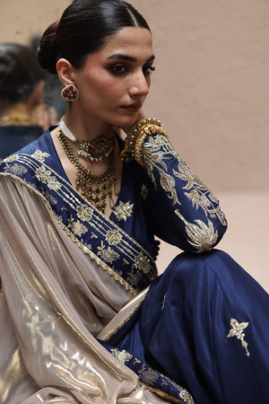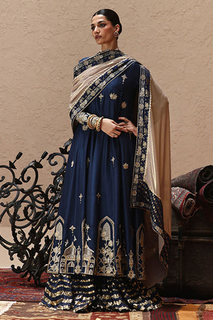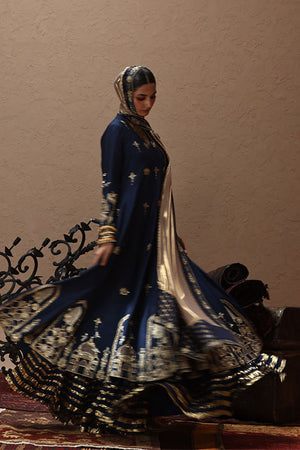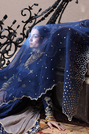 An ode to timeless elegance, this deep blue angarkha kalidaar in pure 80gms raw silk is adorned with light and dark gold zari embroidery, antique lame, and exquisite zardozi work with kora, dabka, cutdana, stones, pearls, nakshi, sequins, and silver bird motifs on the front, sleeves, and back. Paired with crushed dhaka pants, the look is styled with three dupatta options: a pure medium silk dupatta with a four-sided gold border, a pure organza dupatta with scalloped zari embroidery, sequined handworked border and chan, and a gold lame dupatta detailed with zari embroidery, handworked borders, and banarsi finishing.