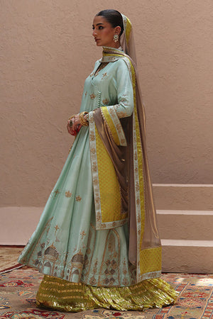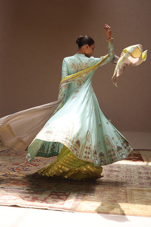 This aqua angarkha kalidaar in pure 80gms raw silk is adorned with light and dark gold zari embroidery, antique lame, and intricate zardozi work featuring kora, dabka, cutdana, stones, pearls, nakshi, sequins, and silver bird motifs on the front, sleeves, and back. Paired with crushed lime dhaka pants for a fresh, vibrant contrast, it can be styled with your choice of dupatta: a pure medium silk with a four-sided gold border, a pure organza with scalloped zari embroidery, sequined handworked border and chan, or a gold lame dupatta enriched with zari embroidery, handworked borders, and banarsi detailing.