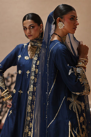 This deep blue ensemble in pure 80gms raw silk features a short shirt with pockets, richly adorned with light and dark gold zari embroidery, antique lame, and intricate zardozi work including kora, dabka, cutdana, stones, pearls, nakshi, sequins, and silver bird motifs on the front, sleeves, and back. Paired with farshi culottes detailed with sequins at the hem, the look is completed with your choice of dupatta: a pure silk with a four-sided gold border, an organza with scalloped zari embroidery, sequined handworked border and chan, or a regal gold lame with zari embroidery, banarsi finishing, and handworked borders.