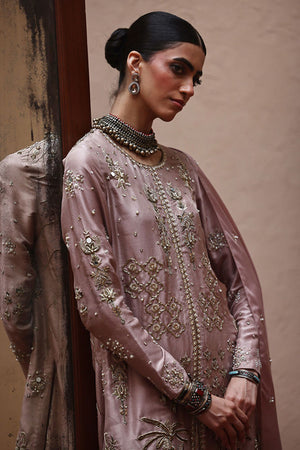 Misty Rose short shirt in pure 80gms raw silk, featuring gold and antique zari embroidery with zardozi work that includes kora, dabka, cutdana, stones, pearls, nakshi, sequins, and mirror on the front, sleeves, and back. Paired with flowy shimmer crush culottes and a pure medium silk dupatta with all-over botis and chan, embellished with pearls, mirrors, and stones.