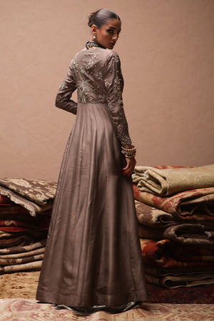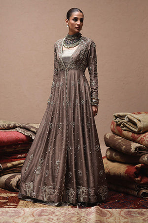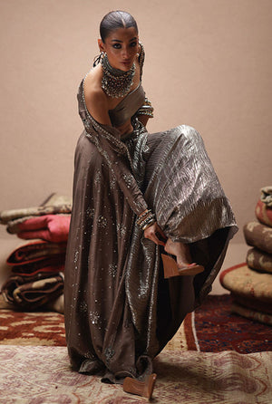 Rockridge front-open kalidaar in pure 80gms raw silk, adorned with gold and antique zari embroidery with zardozi work featuring kora, dabka, cutdana, stones, pearls, nakshi, sequins, and mirror on the front, sleeves, and back. Paired with a shimmer silk tube (length customizable), a shimmer crush lehenga, and a pure medium silk dupatta with all-over botis and chan, embellished with pearls, mirrors, and stones.