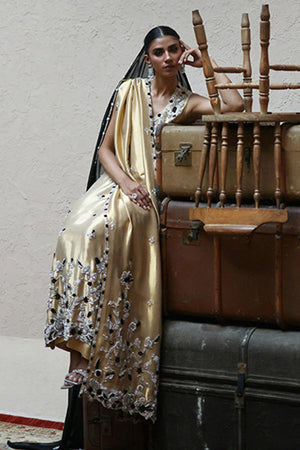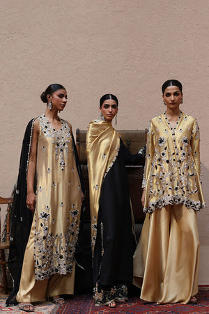 The straight long shirt in Rich Gold is tailored from luxurious lame fabric, intricately adorned with silver and black zari embroidery and enriched with heavy zardozi work including kora, dabka, cutdana, stones, pearls, nakshi and sequins on the front and back. Paired with cotton charmeuse culottes, the ensemble embodies effortless grace and sophistication, while a black lame chiffon dupatta completes the look with its four-sided zari and hand-embroidered bail detailed with all-over silver and gold zardozi botis for a regal finish.
