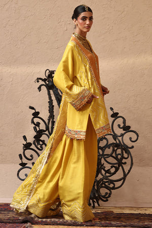 The short kurta with pockets in vibrant yellow, crafted from pure 80gms raw silk, is adorned with gold gota work, zari embroidery, and colored appliqué, further enriched with intricate zardozi detailing of kora, dabka, cutdana, stones, pearls, nakshi, and sequins on the front and sleeves. Paired with pure raw silk farshi culottes finished with a classic gota border, the ensemble is completed with two dupatta options: a net dupatta in vibrant yellow featuring a four-sided border and all-over gota, zari, and sequins embroidery, or a pure organza dupatta with a four-sided embroidered border and delicate all-over botis for graceful elegance.
