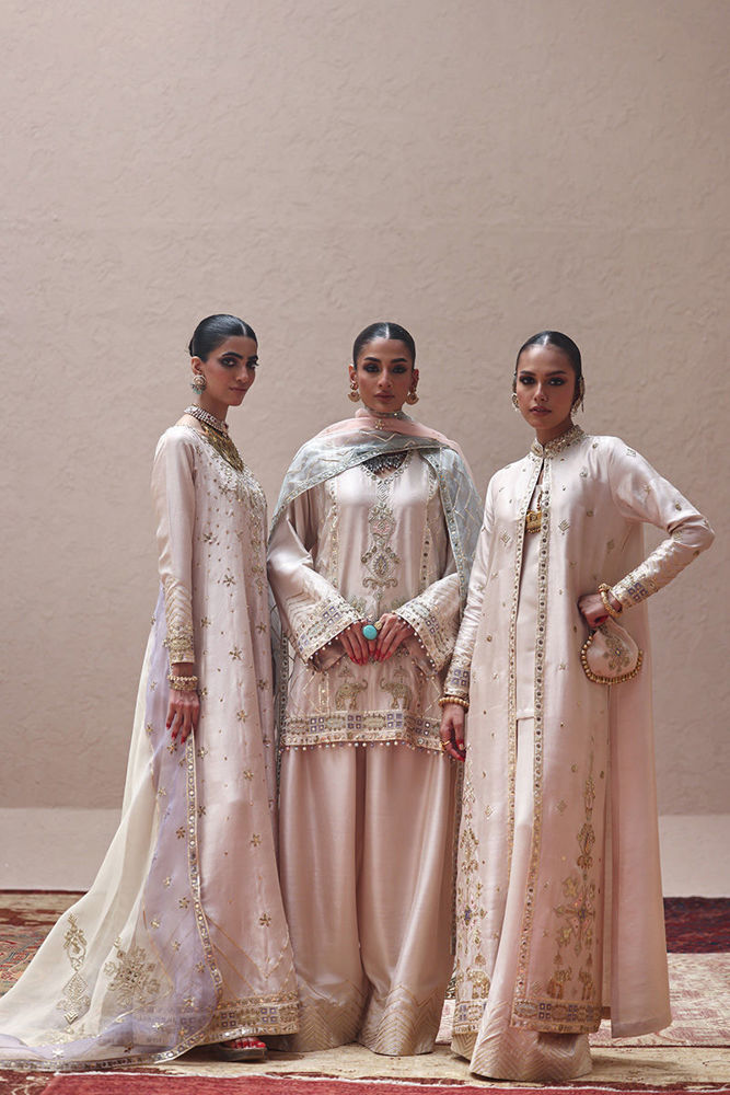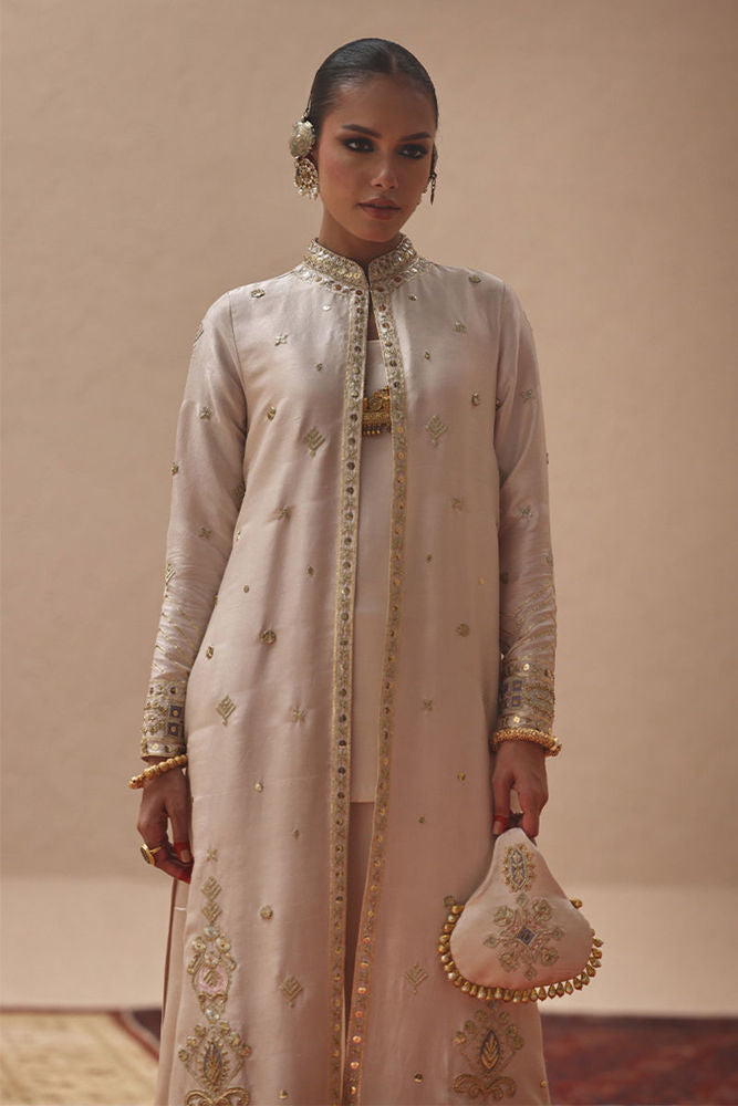The Seed Pearls jacket, crafted from pure 80gms raw silk, is beautifully embellished with gold gota work, zari embroidery, and colored appliqué. Intricate zardozi work with kora, dabka, cutdana, stones, pearls, nakshi, and sequins enhances the front and sleeves, giving the design a regal touch. It is styled with a sleeveless inner in cotton charmeuse for effortless layering. The look is completed with cotton charmeuse culottes, finished with a traditional gota border that adds a graceful edge.