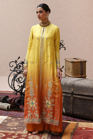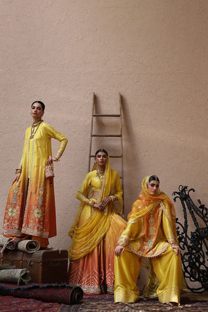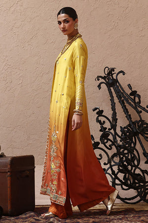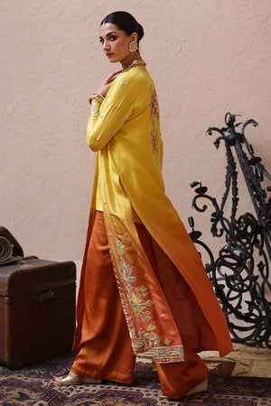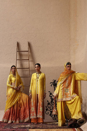 The jacket in a vibrant yellow and orange ombré, crafted from pure 80gms raw silk, is intricately embellished with gold gota work, zari embroidery, and colored appliqué. Its front and sleeves are further enriched with zardozi detailing, featuring kora, dabka, cutdana, stones, pearls, nakshi, and sequins for a strikingly regal finish. Styled with a sleeveless inner in yellow cotton charmeuse, the ensemble is paired with orange cotton charmeuse culottes, defined with a traditional gota border that adds the perfect touch of elegance.
