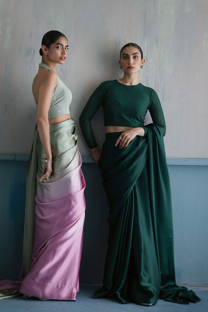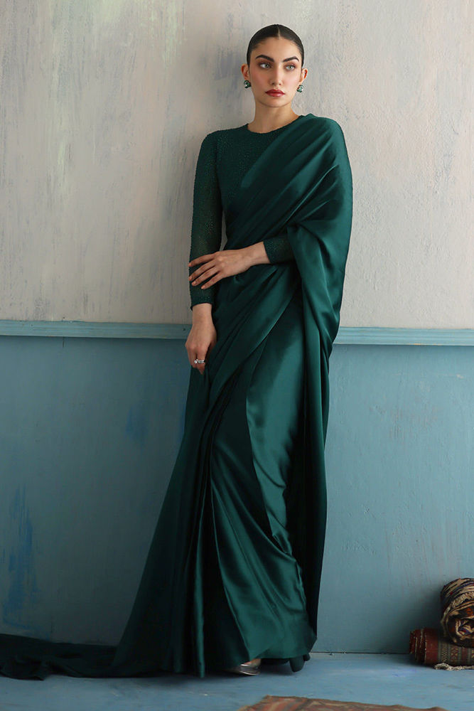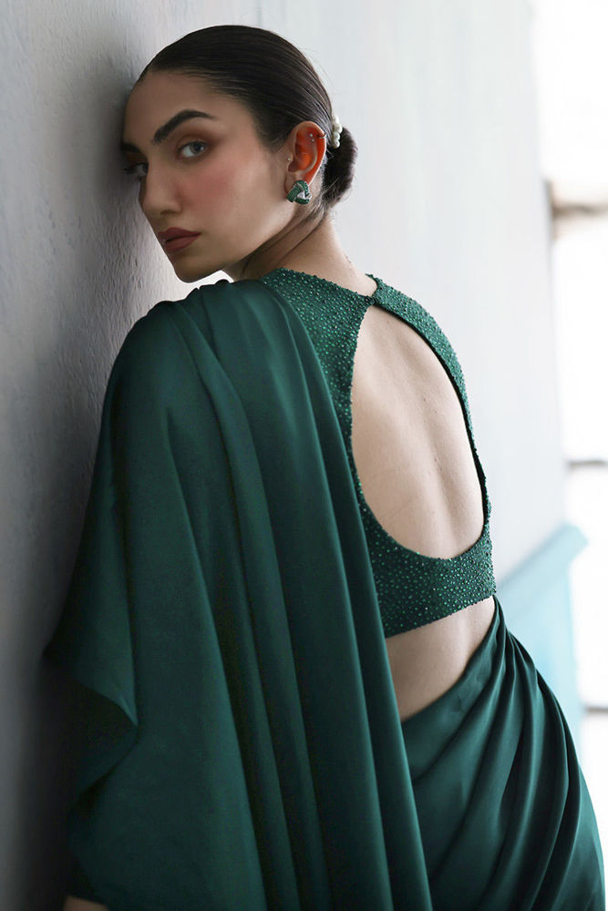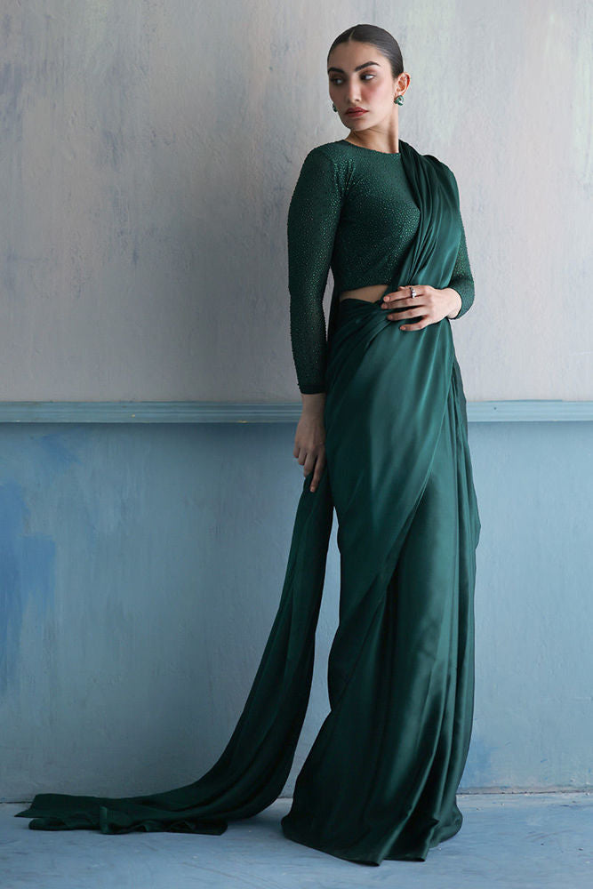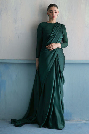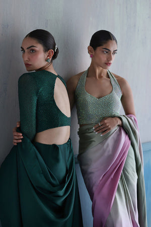 Experience the allure of timeless sophistication with our "Smoked Pine Elegance Saree Set". This ensemble embodies the perfect blend of opulence and grace, designed to make you shine on every occasion. The saree is accompanied by a Swarovski-studded blouse that adds a touch of glamour to your ensemble. The deep, rich hue reminiscent of smoked pine forests creates an aura of mystery and elegance. As you drape the saree, its silky texture cascades with regal grace.