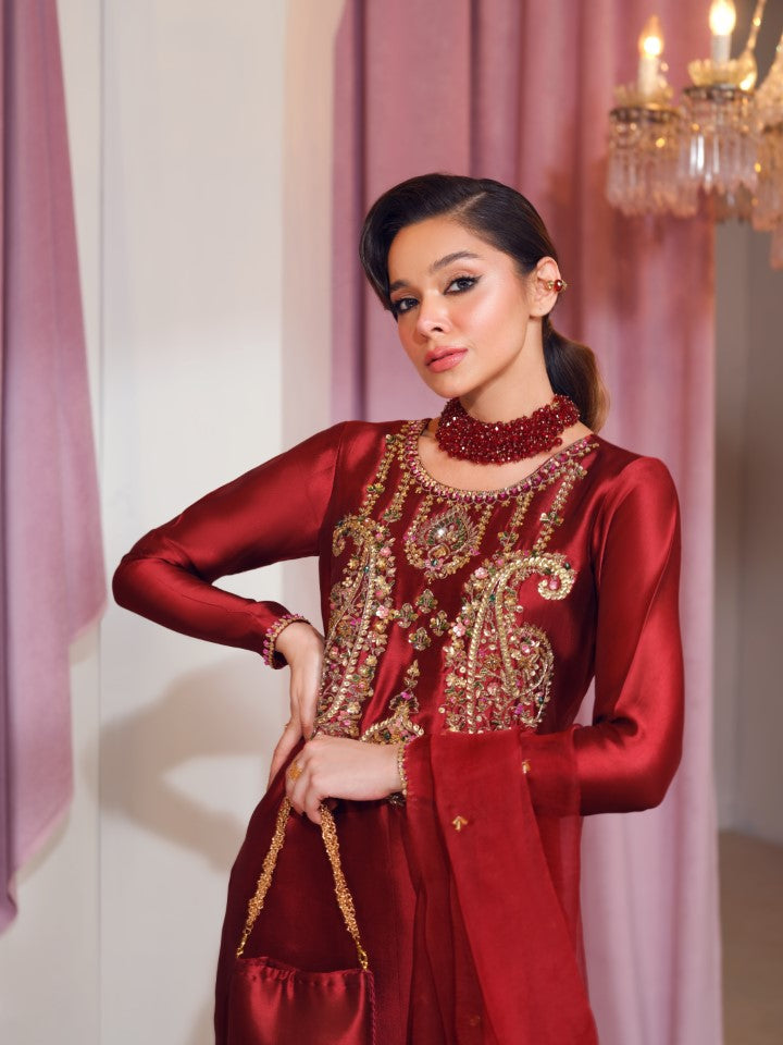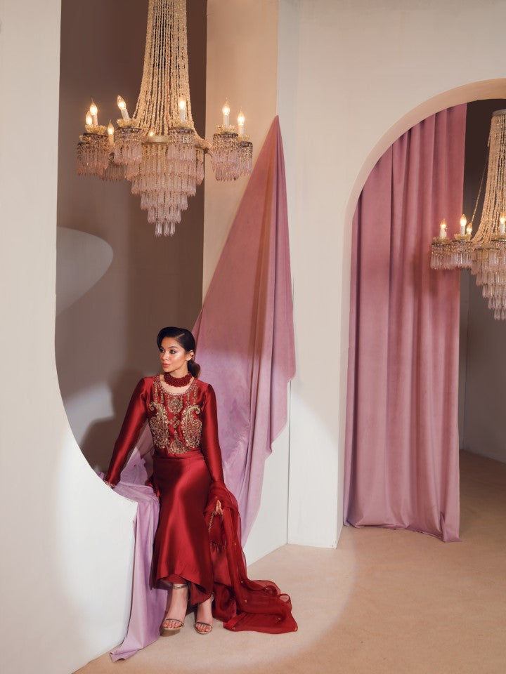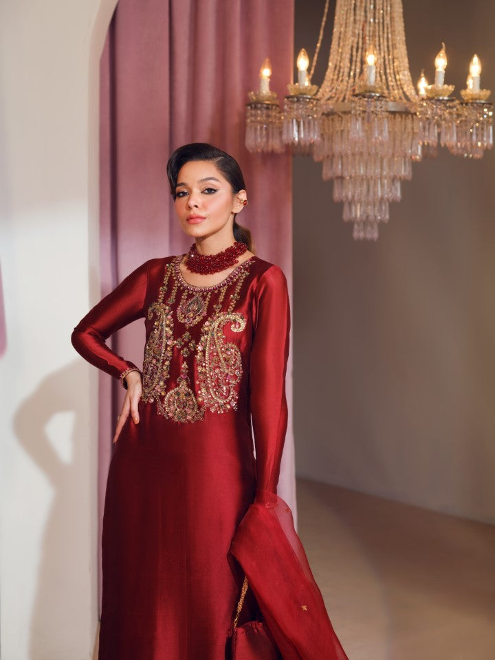 This elegant ruby red long shirt is aesthetically decked with silver green and pink embellishments around the keyhole neckline. Dupatta is in organza with sequin chun on it and the outfit is paired with bootcut pants.