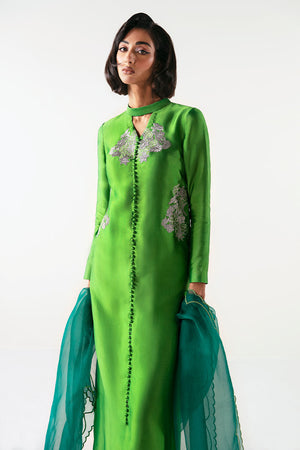 Step into the spotlight with 'Lady in Neon'. Elevate your style in this stunning sharp green ensemble, featuring an embroidered long tissue silk dress with front buttons and a collar, complemented by fitted sleeves for that perfect silhouette. Paired with Thai Silk Cigarette Pants and a mesmerizing embroidered scalloped organza dupatta. Shine bright, radiate elegance.The shipping charges for all articles barring Bridals are as follows: