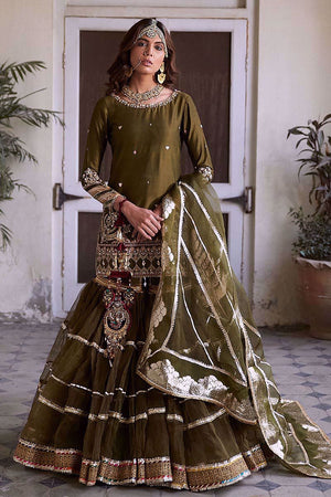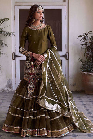 Lailomah of Nizampur has the understated charm of a mughal princess. A dull fern green base constructed in our signature kameez silhouette complete with an embellished daman and chatta patti sleeves. Paired with the unmatchable grace of a lucscious organza crushed gharara and dupatta with zarii accents.