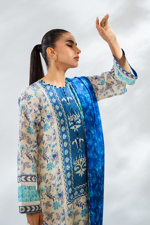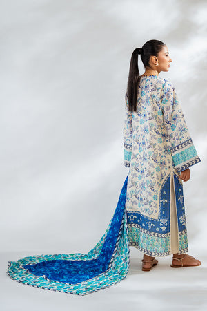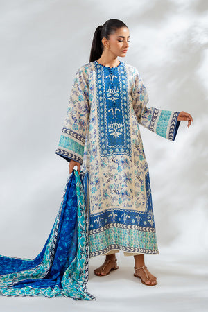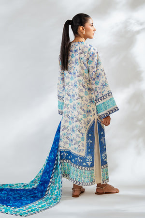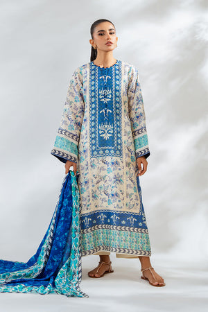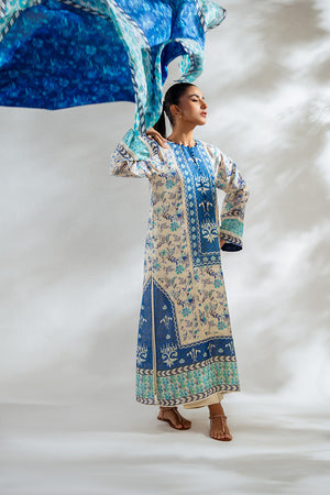 Timeless yet contemporary, this beige khaddi silk shirt spotlights a mystical floral pattern and traditional paisley print, with textured brush strokes on the hem of the long, loose cut silhouette. The paisley print traces the borders of the cerulean blue silk dupatta with a self print. The beige pure rawsilk trousers pair seamlessly with the printed shirt and dupatta.