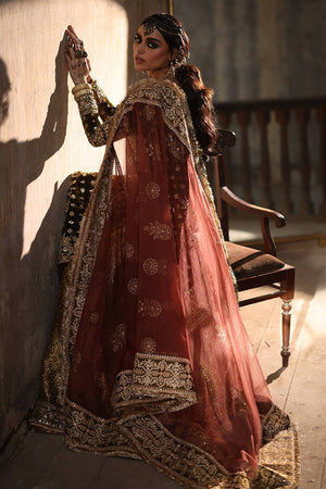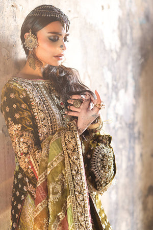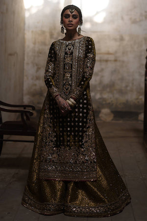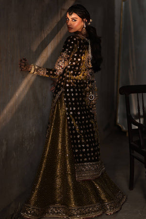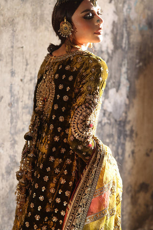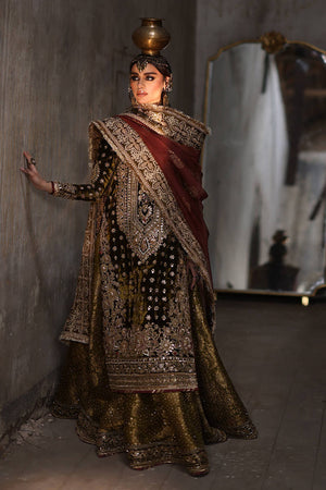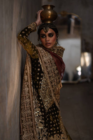 Step into sophistication with "Lajjo" in rich Tuscan olive green from the Gold Series Hussan Ara Mansion Collection by Mohsin Naveed Ranjha. The long kameez, adorned with opulent multihead embroidery on luxe velvet, features an elongated embroidered neckline in gold, inspired by architectural intricacies and floral motifs, embellished with trims, sequins, and beadwork. Paired with a rich silk Jamawar Sharara featuring heavy adda work and embellished velvet borders, it's a celebration of luxurious craftsmanship. Complete your ensemble with two divine dupattas: one a lazer pathed multi-head embroidery dupatta with heavy adda work and four-sided heavy embellished borders, and the other featuring block printed motifs and light embellishments, made of organza fabric. The accompanying pouch, adorned with sumptuous embroidery and gold embellishments, adds the perfect finishing touch.