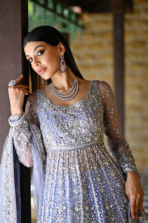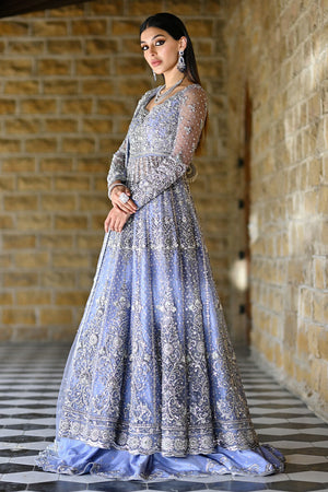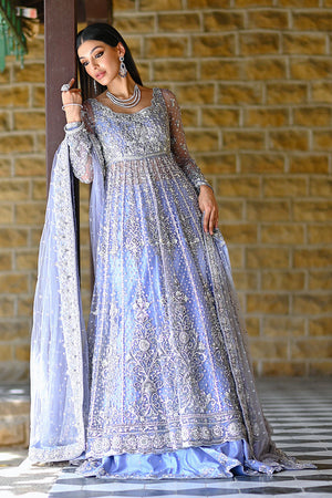 A soft periwinkle net kalidaar with a cutwork neckline and long fitted sleeves, fully embellished with silver sequins, tiki stones, pearls, and dabka. The periwinkle raw silk lehenga features a unique swirly cutwork hem with matching embellishment. A net dupatta frames the look, finished with delicate chan and a matching embellished border.