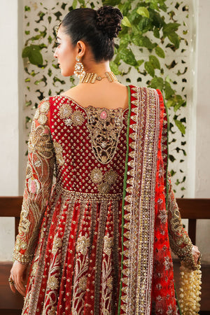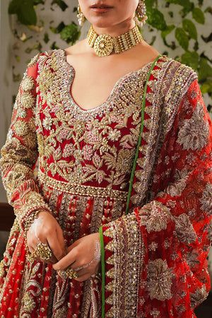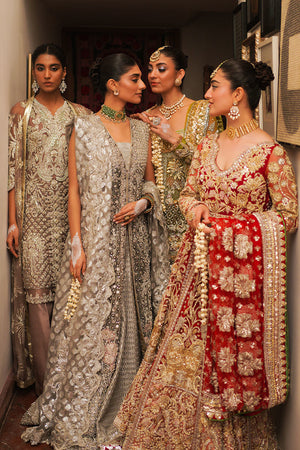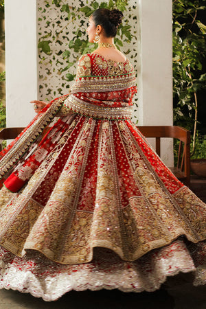 This exquisite bridal outfit is rendered in a beautiful shade of classic red. It comprises a 21-paneled classic red pishwas, hand-embellished with gold and silver embroidery, traditional nakshi, dabka, sequins, and shiny stones. The pishwas is crafted from net, while the bodice and lehnga are made from pure raw silk, creating a harmonious blend of textures. The lehnga boasts a captivating flare, making a bold statement at any event. To complete this regal look, the dupatta features heavy hand embellishments and a four-sided border with intricate boti chan detailing. "Lalpati" is a celebration of classic red, tradition, and artistry, embracing a timeless style that embodies the grandeur of the ages.