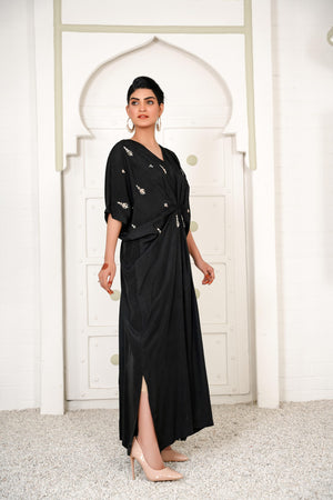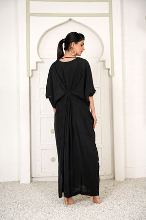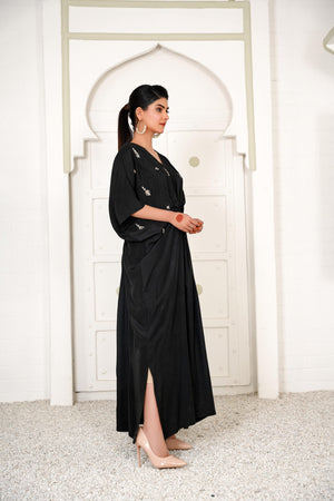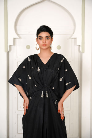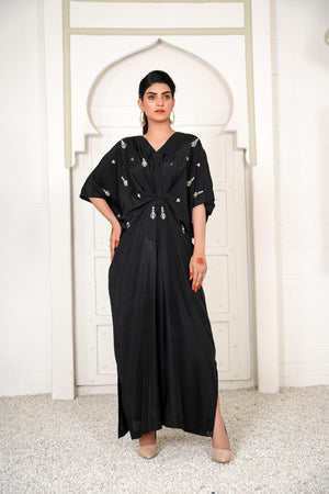 Lara is a black celestial kaftan with pearls and crystal motifs half of the front. It gives you a dreamy look which evokes the feeling of eternity.