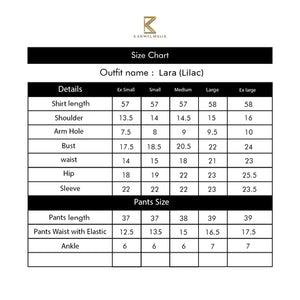 Lara, the ethereal outfit is a lovely day and night formal wear. Lara portrays a long organza shirt, with two front slits, and sparkling crystal ornamentation on a shimmery lilac canvas. This pleasing pattern makes this outfit outstanding while paired with ruffled dupatta and cigarette pants and pearl details on the hem.