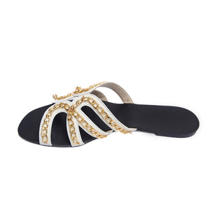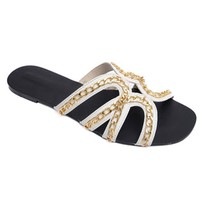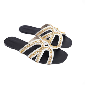 Our signature scalloped slide crafted in a Faux leather, with whipstitch and chain-link details in gold. This closet classic will be your staple for those summer days ahead.