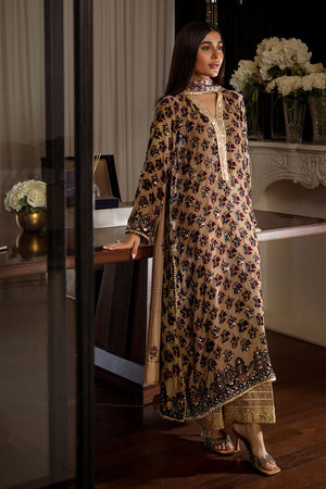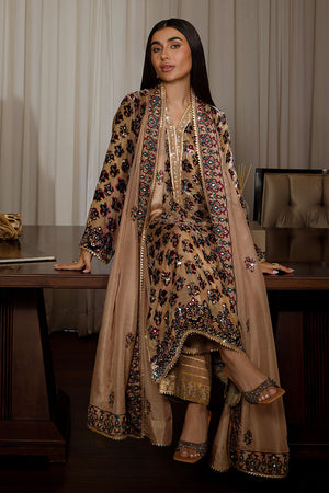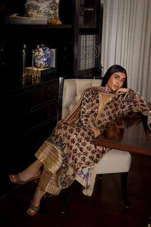 Elevate your wardrobe with this exquisite beige discharge print ensemble. The long shirt features a striking silhouette, while the pants boast intricate deatils shimmering tilla pati embellishments. This luxurious combination exudes sophistication and timeless elegance.