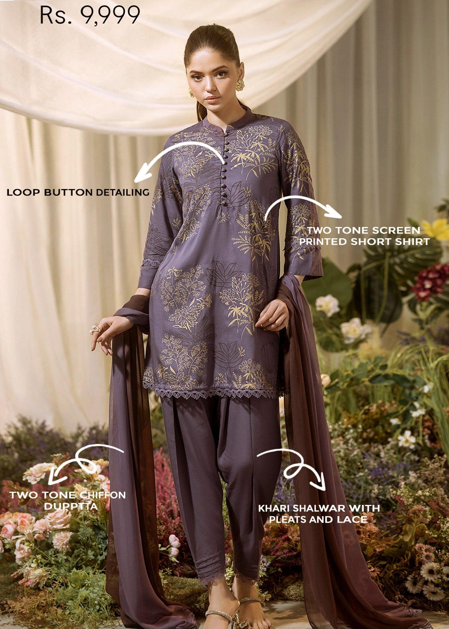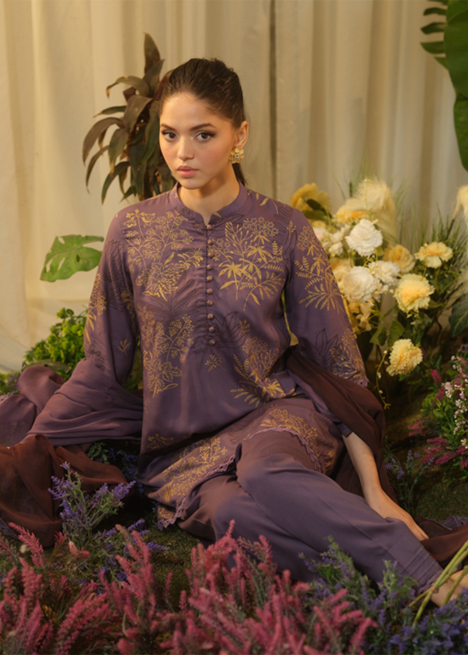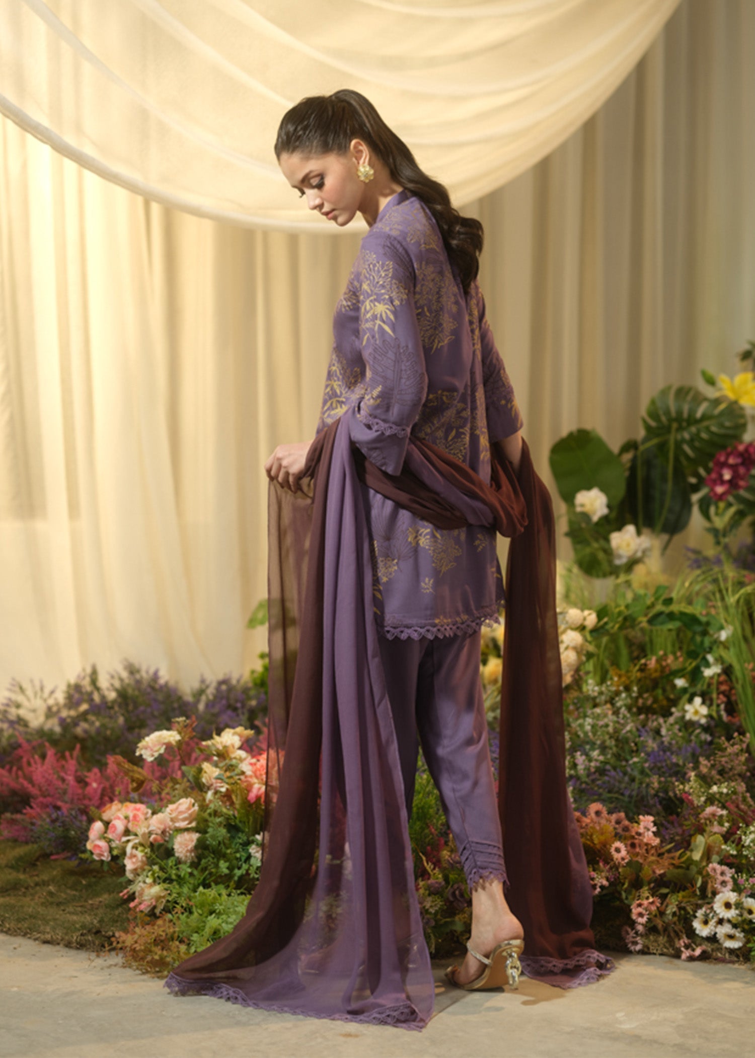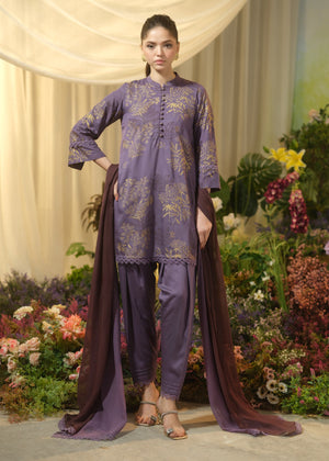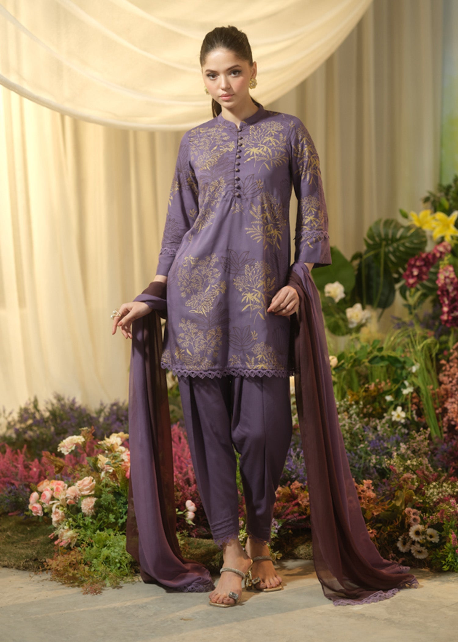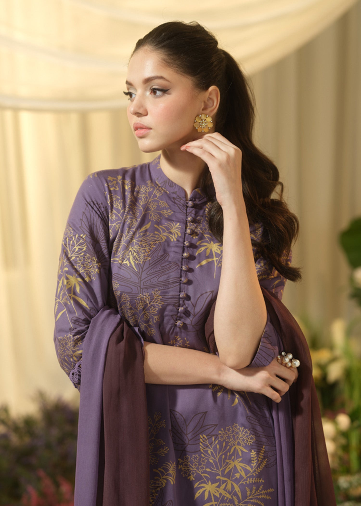 This elegant lavender kurta features a delicate screen print design, accentuated by intricate lace detailing. It is paired with a matching Khari Shalwar, offering a traditional yet stylish touch. The ensemble is completed with a stunning two-tone dupatta, finished with lace trim for added charm and sophistication. Perfect for formal or festive occasions, this outfit blends timeless grace with contemporary flair.