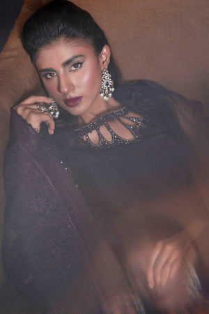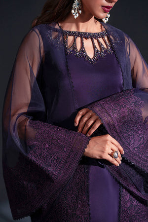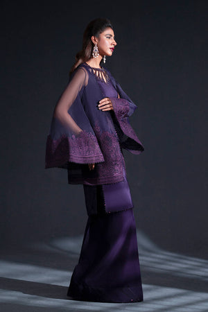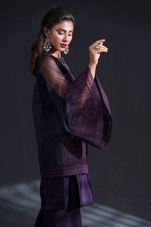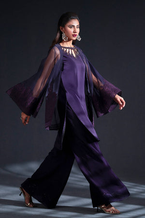 In a rich plum hue, this ensemble layers a dramatic organza jacket, its dramatic wide flared sleeves embroidered with sprawling floral motifs, over a silk inner shirt. The shirt’s neckline is detailed with intricate cutouts and delicate beadwork, an exquisite counterpoint to the jacket’s bold ornamentation. Boot-cut trousers, dramatically cut, are adorned with lace peeking out from their cuffs, echoing the lace accents on the shirt hem, creating a seamless harmony of texture, color, and detail.