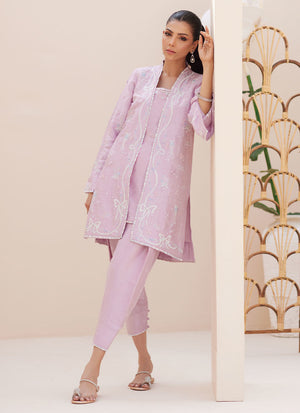 Your must-have essential for all festivities is finally here! A lilac jacket cut from pure raw silk features delicate silk thread work in ivory and pastel hues. Pearls, sequins and mini 3D flowers are hand embroidered to make you shine through all occasions. The jacket is layered over a pure raw silk slip with floral motifs and a gorgeous border on the neckline to make sure you get through those afternoon teas and late-night dinners with effortless ease. Style yours with our pure raw silk shalwar and clear high heels to complete your outfit.