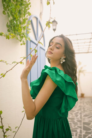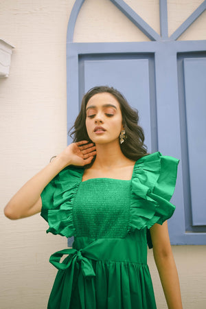 We heard this summer is all about taking risks- so we chose this gorgeous green dress to accentuate one's eyes and beat the summer heat! Smocked body and frilled sleeves is all that you need to slay the season! Material: Cotton.