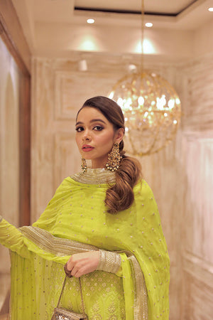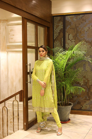 This Apple green traditional yet chic cut is a statement to carry. Heavily embellished front shirt in chiffon fabric finished with gota lace borders. Back of shirt has sequin chatta and lace borders. Chiffon duppata with sequin chatta and four sided laced borders. Comes with a plain chooridaar.The shipping charges for all articles barring Bridals are as follows: