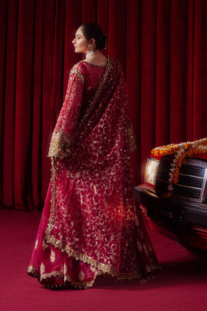 Step into the enchanting world of "Leela" from MNR’s Dur-e-Nayab 2024 unstitched collection. This pomegranate red organza ensemble radiates vibrancy with its intricate thread and tilla embroidery, shimmering sequins, and delicate panni details. Hand-applied pearls add a luminous touch, making each movement dazzle. The organza gharara pants feature a silver-gold foil print and detailed hem, perfectly complementing the rich red hue. Paired with a matching organza dupatta adorned with embroidery and a four-sided border, "Leela" is a true celebration of elegance.
