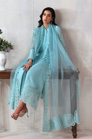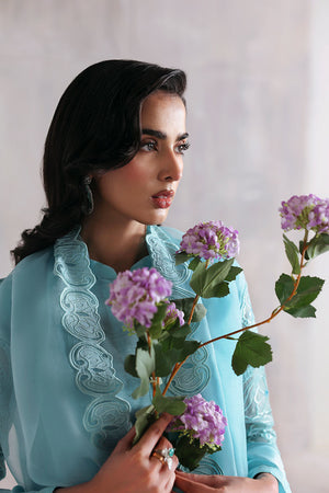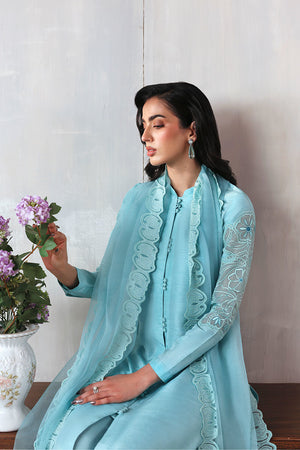 The light firozi blue shirt, crafted from soft Korean raw silk, exudes an understated charm. Paired with matching raw silk pants and an elegant organza dupatta, this ensemble blends effortless grace with luxurious fabric, perfect for any occasion.