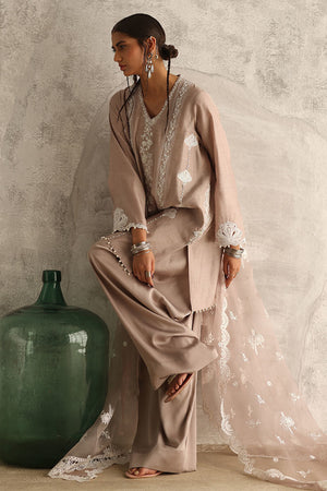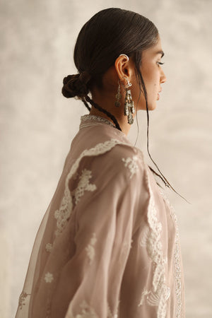 Indulge in sophistication with our Pale Mauve ensemble. Crafted from pure premium khaadi silk, the shirt features resplendent resham embroidery, meticulously adorned with pearls, sequins, moti, tiki stones, kora, and dabka for a captivating finish. Paired elegantly with candy crepe shalwar, offering comfort without compromising style. Complete your look with a pure organza dupatta, adorned with resham embroidery scallops and intricate booties, exuding timeless charm and grace.