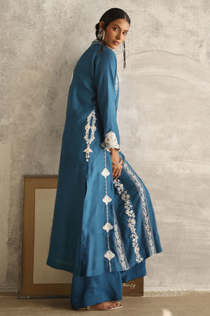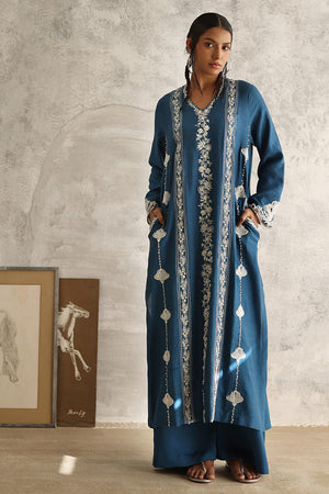 Elevate your style with our Sapphire ensemble. Crafted from pure premium khaadi silk, the shirt boasts resplendent resham embroidery, meticulously adorned with pearls, sequins, moti, tiki stones, kora, and dabka, offering a touch of opulence. Paired with candy crepe culottes, providing both comfort and sophistication. Complete your look with a pure organza dupatta, featuring resham embroidery scallops and delicate booties, adding a timeless charm to your ensemble.