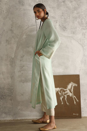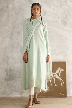 Indulge in the serene elegance of our Misty Aqua ensemble. The plain Khadi shirt is adorned with allover resham embroidery, enhanced by delicate touches of pearls, sequins, cutdana, moti, and naqshi, exuding an ethereal charm. Complemented by comfortable rayon satin pants for effortless grace. Complete your look with a chiffon dupatta featuring intricate lace detailing on all four sides, adding a touch of sophistication to your attire.