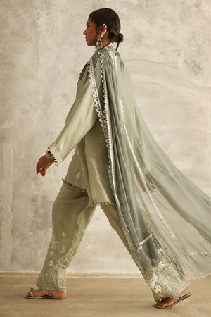 Introducing our desert sage ensemble, a stunning combination of elegance and sophistication. Crafted from pure raw silk 80 gms, the straight short shirt features exquisite Resham embroidery boti on the shirt, along with embroidered sleeves borders and daman adorned with delicate crystals and pearls. Paired with pure raw silk bottoms, fully embroidered to enhance its allure. Complete the look with a chiffon dupatta boasting intricate embroidery and delicate lace detailing on all four sides, adding a touch of grace to your ensemble.