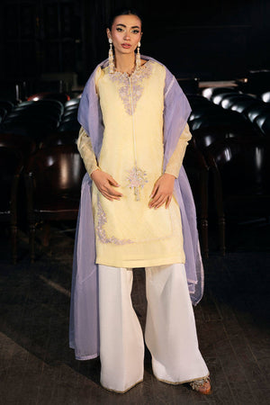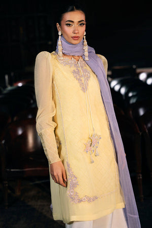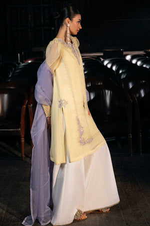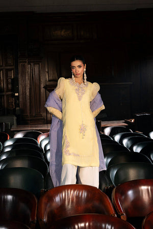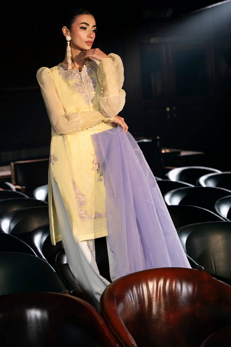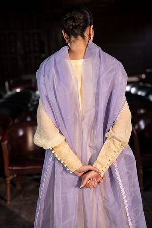 Lemon Dream is a chic mid-length khaddi silk shirt with ivory and lilac embroidery, tassel accents, and elegant puff sleeves. Paired with white flared pants and a lavender organza dupatta, it’s a perfect blend of sophistication and charm.