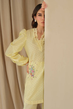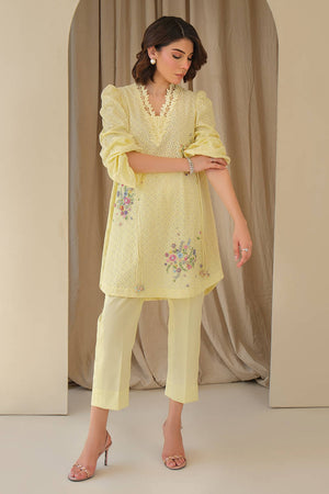 Our signature French knot florals with a hint of sparkle bring this sunshine lemon to life. The crisp Cotton eyelet shirt comes with statement sleeves enhanced with tassels. Comes with Cotton pants.
