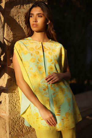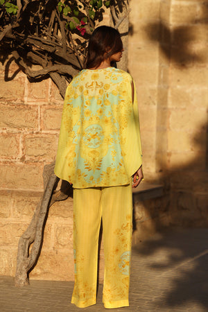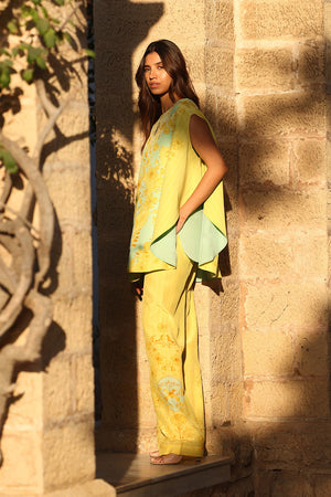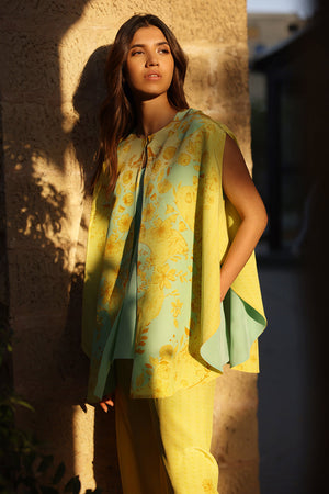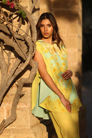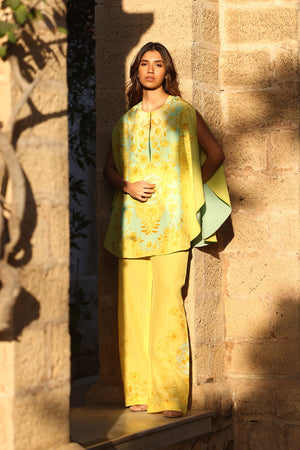 Perfect for a modern muse looking for serene elegance, a crepe top featuring a delicate aqua and sun-kissed yellow floral print. Statement cape sleeves drape luxuriously offering a chic silhouette. Paired with flowing lemon yellow hued painterly printed trousers cut from crepe.