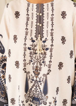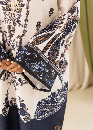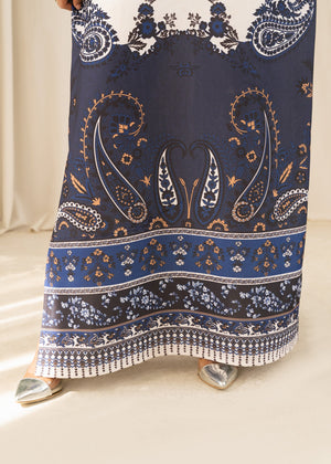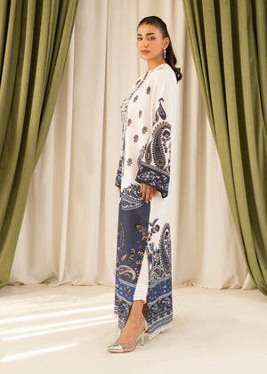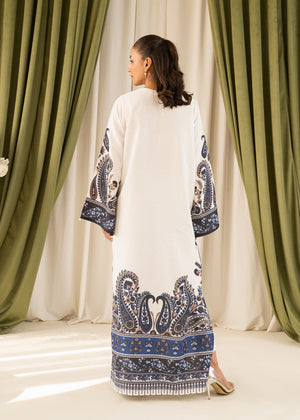 A classic floor length kaftan in fine silhouette Crepe. Includes a Crew neckline, full-length bell sleeves, pearl detail along the neckline and sleeves. The shirt has short slits on the sides, paired with fitted pants.