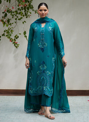 LEONA EMERALD EMBROIDERED COTTON NET SHIRT WITH SILK DUPATTA - Tara Luxe II by Farah Talib Aziz