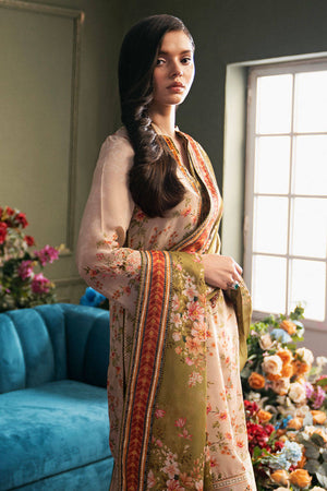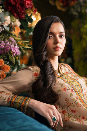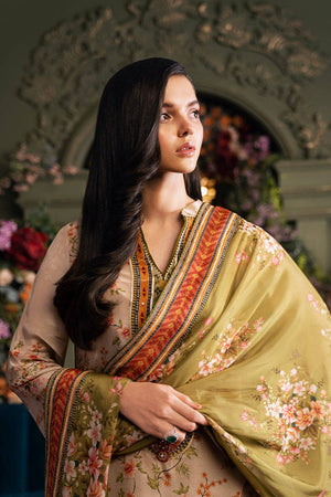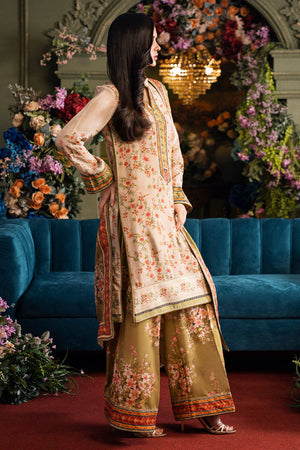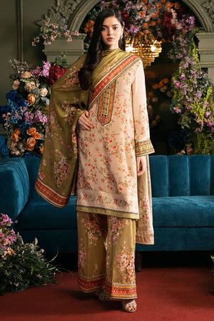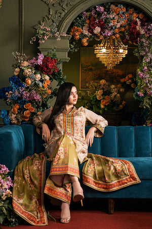An eye-catching ivory digital printed shirt with delicate embellishments on neckline. Paired with stunning pesto green printed flared pants and dupatta.