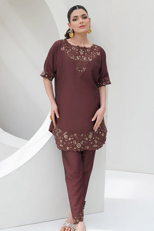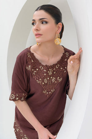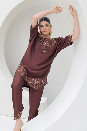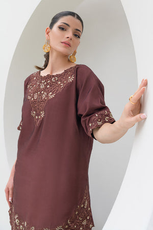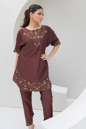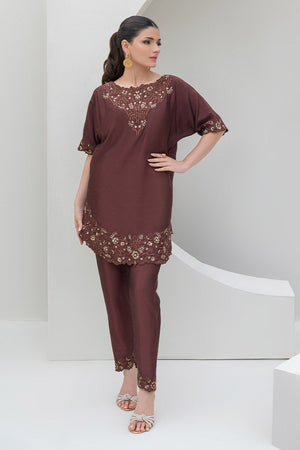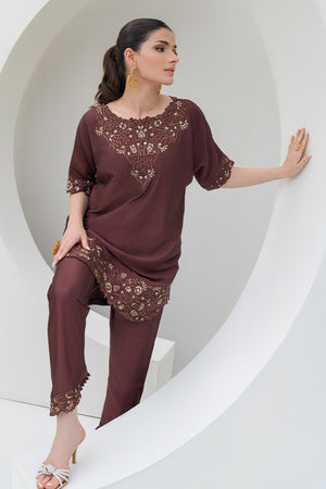 This chic coord set is made from pure shesha silk, featuring intricate hand embroidery of resham and zari on the neckline, sleeves, and daman of the shirt. It is paired with stylish straight tulip-cut pants embellished with buttons for an added touch. The model is wearing a size small, and the length of the shirt is 32 inches. Please note that this set has a loose cut, so its measurements may differ from the standard size chart.