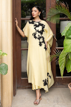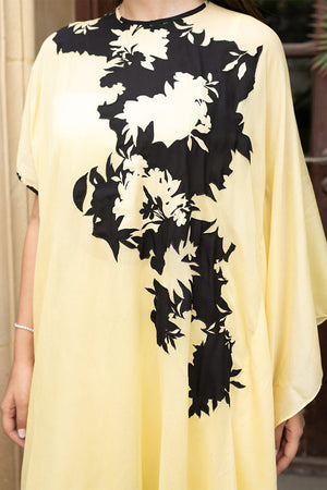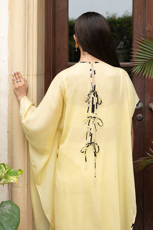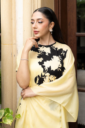 Leya is a masterful blend of style and comfort. Featuring a kaftan silhouette crafted from lightweight lemon yellow chiffon, this piece is adorned with exclusive floral prints and paired with culottes and bandeau. It captures the carefree magic of endless summer days.