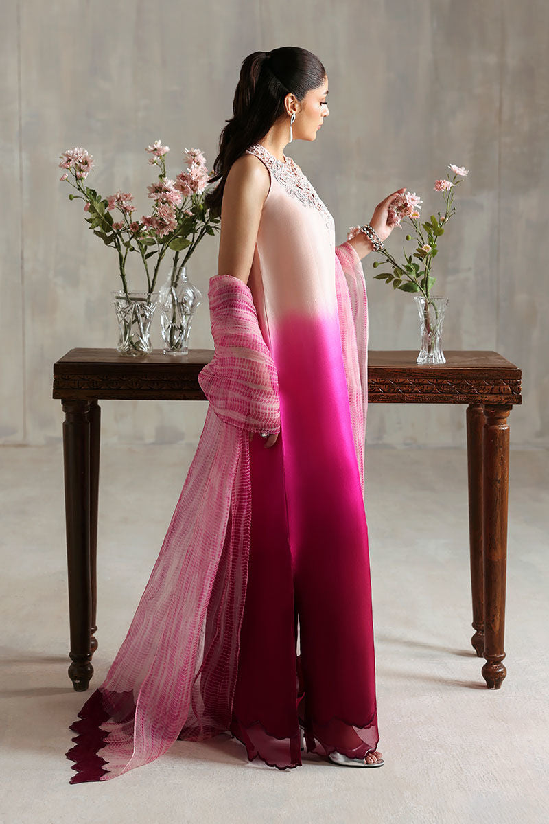 This peach and purple shaded kaftan, made from pure raw silk, exudes elegance and charm. Paired with a soft pure organza dupatta, it creates a refined and graceful look, perfect for any special occasion.