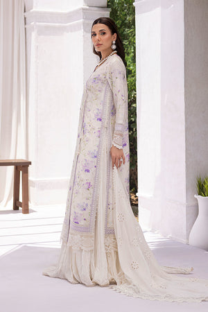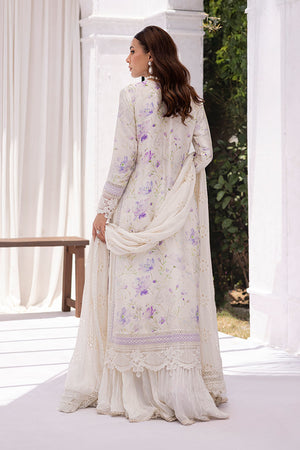 Lilac raw silk shirt in an angarkha style, printed with a soft floral digital pattern. The shirt is adorned with silver handwork along the neckline and borders, with matching laces that enhance the structure of the garment. A silk cutwork dupatta is included, decorated with lace detailing that aligns with the shirt’s design. The ensemble is finished with a silk crushed dhaaka, providing fluidity and ease of movement.