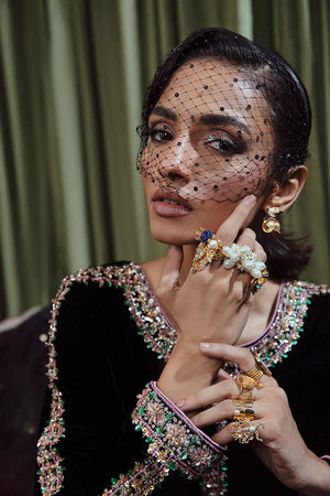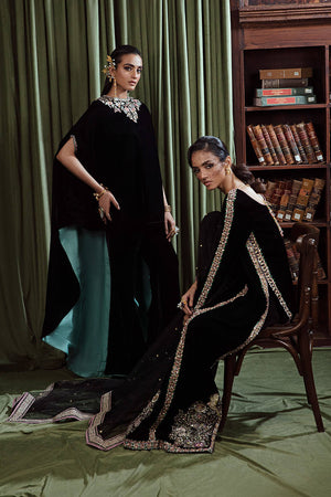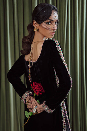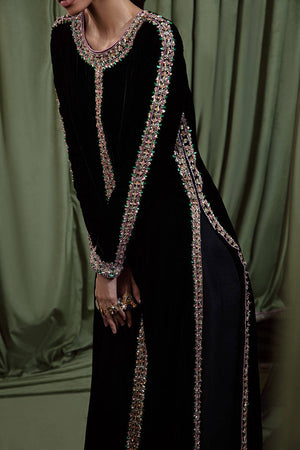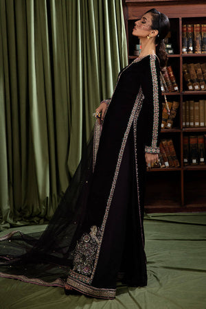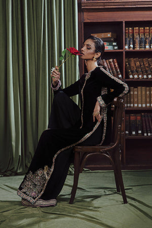 An eye-catching stunning ebony floor-length heavily embellished shirt with fitted sleeves. paired with the same colored flared pants and stunning net dupatta with sprayed sequences all over.