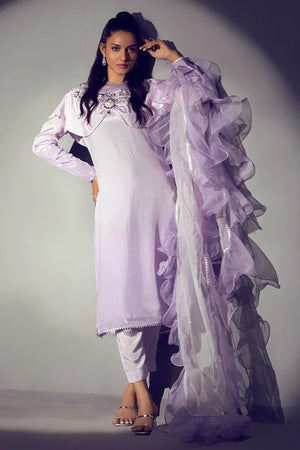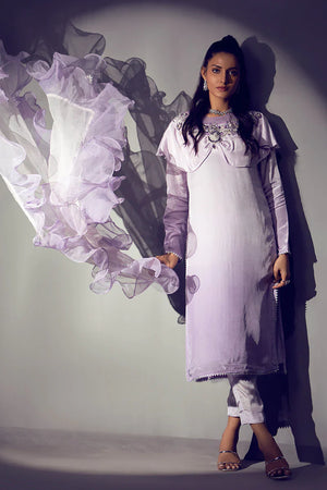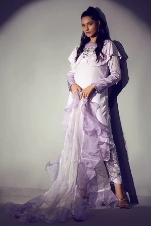Premium tie and dye russian silk shirt styled with cape which is embellished with handwork of kora, dabka, pearls, sequins and stones styled with capri pants and organza dopatta with contrast color frills. Weight of this product is 1