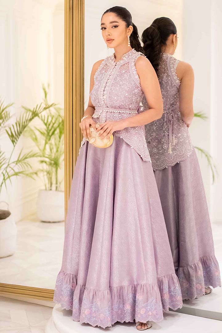 The Lilibet is a lavender flowing, floaty dream for you to indulge in.Cut from intricately embroidered organza and further embellished with subtly shimmering translucent sequins, Swarovski crystals and pearls. The sparkling hi-lo jacket is layered over a floor length kalidaar in lusciously shimmery coordinating tissue. This undeniably glamorous ensemble is further elevated by the delicately embroidered belt to cinch the waist and emphasize the graceful flair.