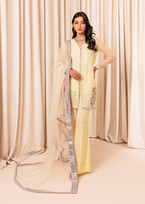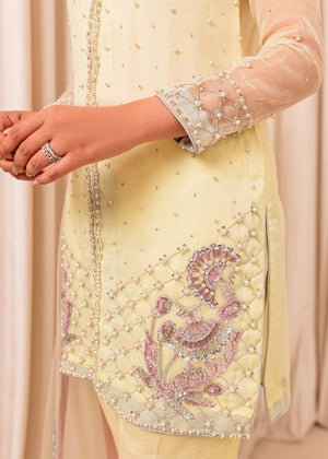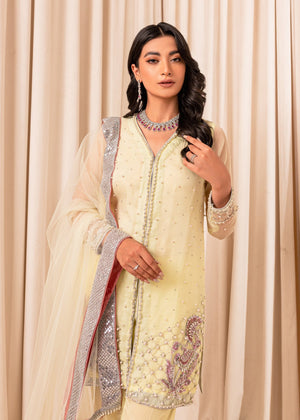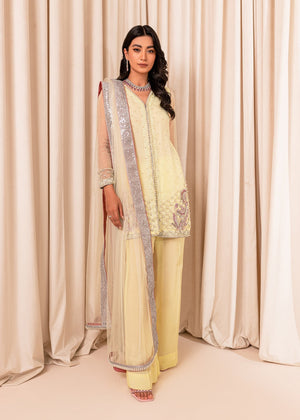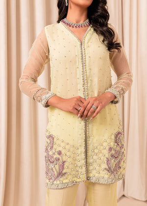 This fresh Lemon yellow three piece set with open front silhouette, enriched with intricate dabka, nakhshi, pearls and stones. The blend of rose pink, creamy yellow and sparkly silver makes it a perfect party wear. Comes with a Net dupatta, silver sequin detailing on all four side borders with the hint of pink! Can be worn as both front open or closed.