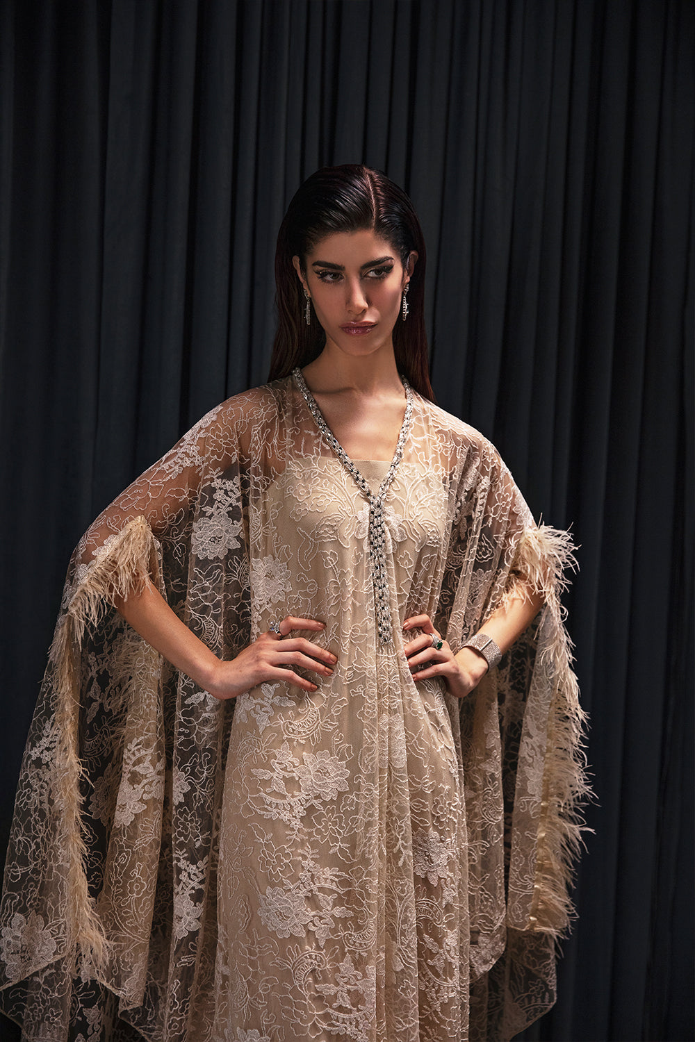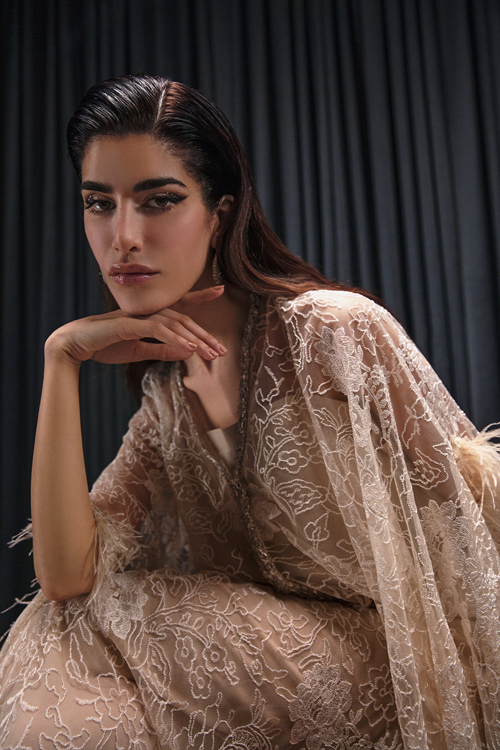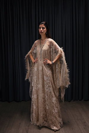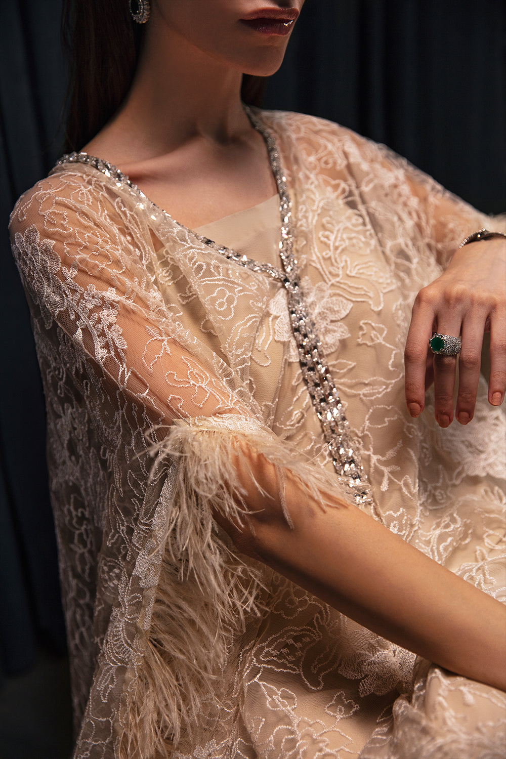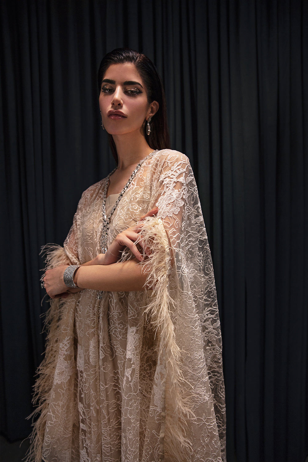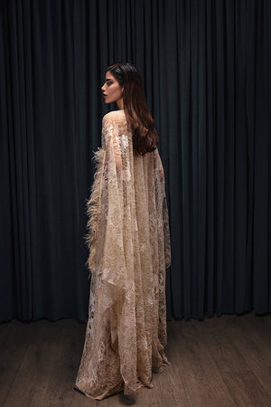 This resham embroidered cape in beige is defined by it’s fine Chantilly texture, features a delicate neckline & feathers trims.