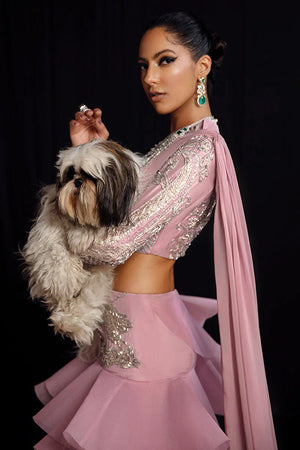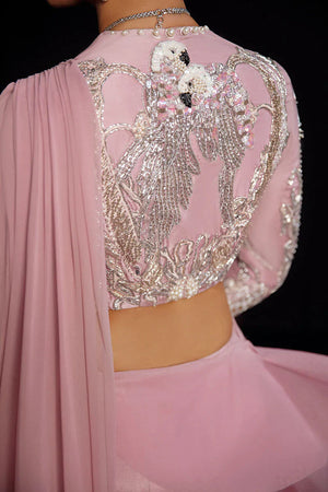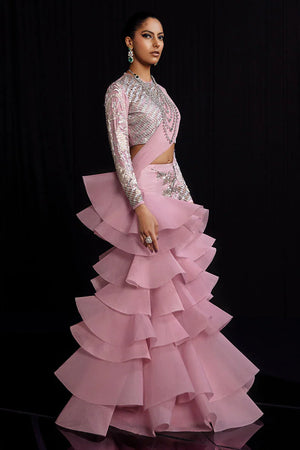 Intricate cut work raw silk blouse in tila and beadle with fitted sleeves purely crafted with hand embellishment in the materials of cut dana and Swarovski stones. Back of the blouse has two exquisitely made parrots combined with floral motifs. It comes with finely crafted mermaid cut ruffled skirt in organza with each ruffle finely fused and stitched together. It also has hand embellishment motifs on the waist part. Finely stitched pleated chiffon pal has been attached with the skirt.