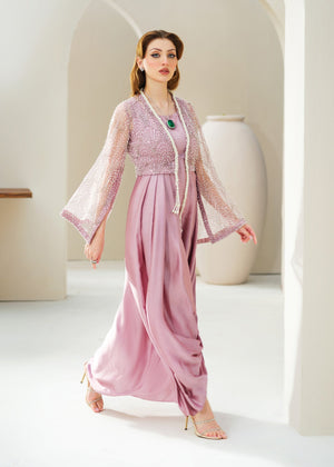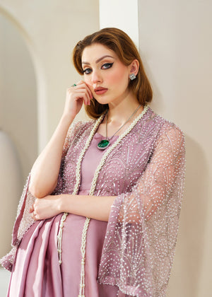 This stitched dress is designed with charming silk fabric and an embellished jacket featuring pearl tassels. It's the perfect combination of elegance and style. Get ready to turn heads and add that extra "omph" to your look!